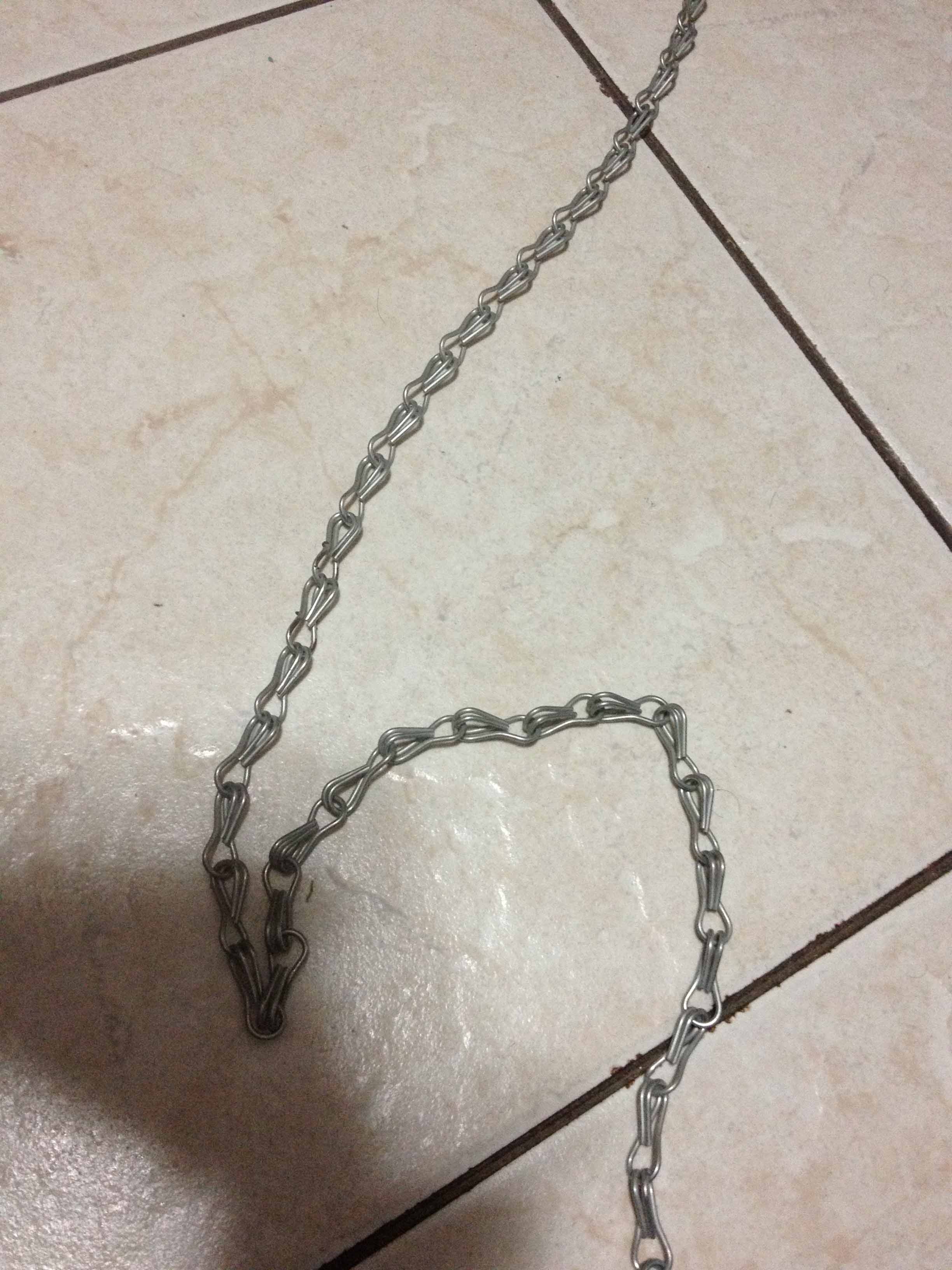 לא ממליץ להשתמש בסוג שרשרת כזאת. ראשית החוליות אינן סגורות כיחידה. וזה מהווה סיכון. אני מכיר את חוזק השרשרת שבתמונה והיא חזקה אבל אפשר להיות מופתע מחוזק המקור של הקוניור. בליעת חוליה כזאת עלולה לגרום לנזק. בנוסף החוליות מגולוונות ועלולות לגרום להרעלת מתכות אם הגילוון יורד מהן. הכי טוב להשתמש בשרשראות עם חישוקים מולחמים שמצופים בצורה טובה.