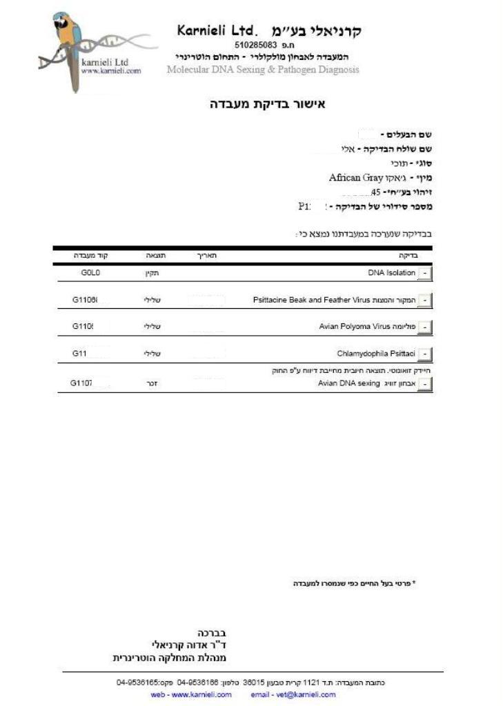 הבדיקה מתבצעת במעבדה ולכן החתימה אינה של הוטרינר אלא של המעבדה הבודקת. הוטרינר יכול לאשר בכתב את הבדיקה.