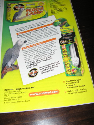 במקומות בהם אין אפשרות כלל לחשוף את התוכי לאור שמש ישנם המשתמשים בתאורה אולטרה סגולה הנותנת תחליף לשמש.