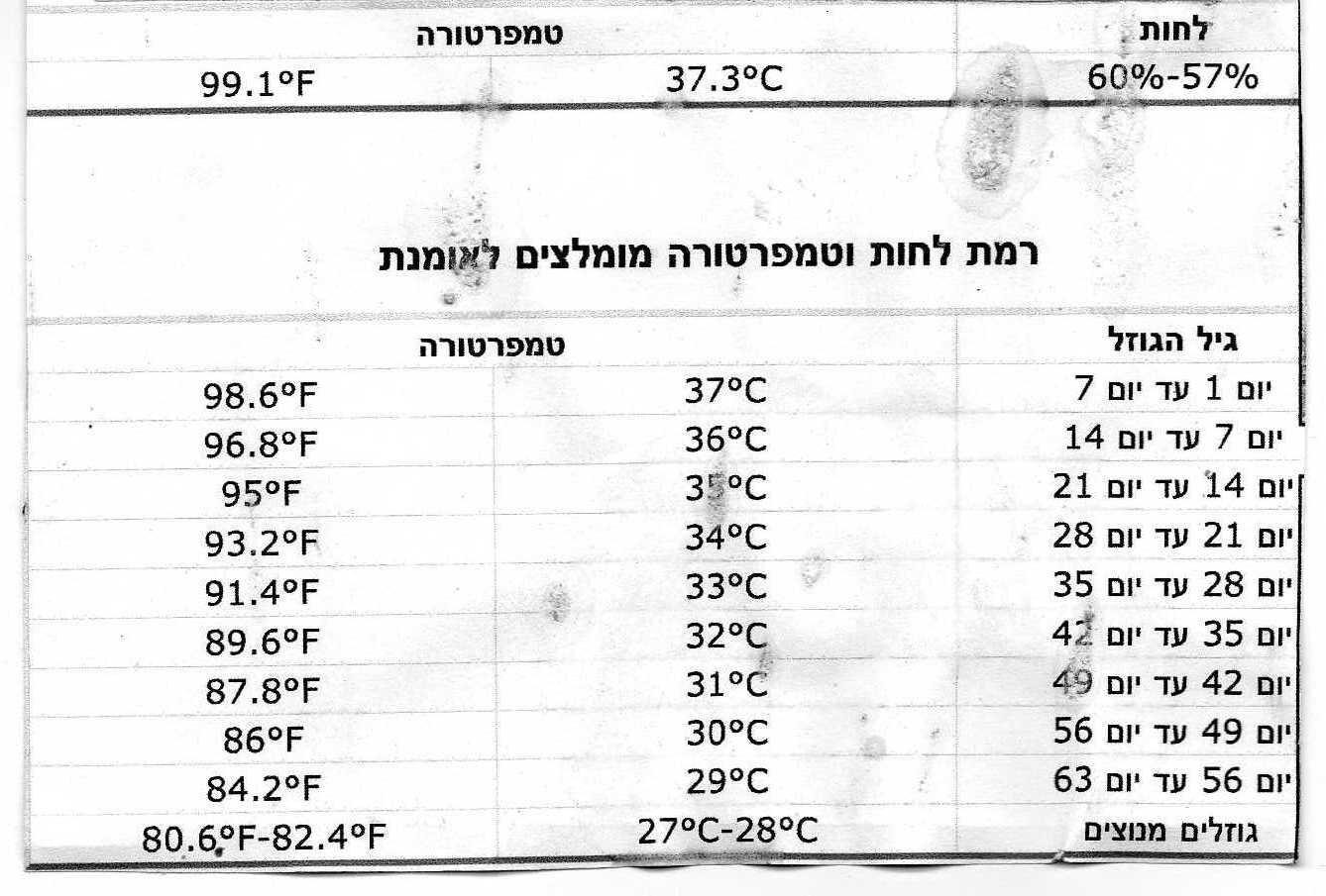 הנה טבלת הטמפרטורה באומנת, לפי התקדמות הגידול של הגוזלים.