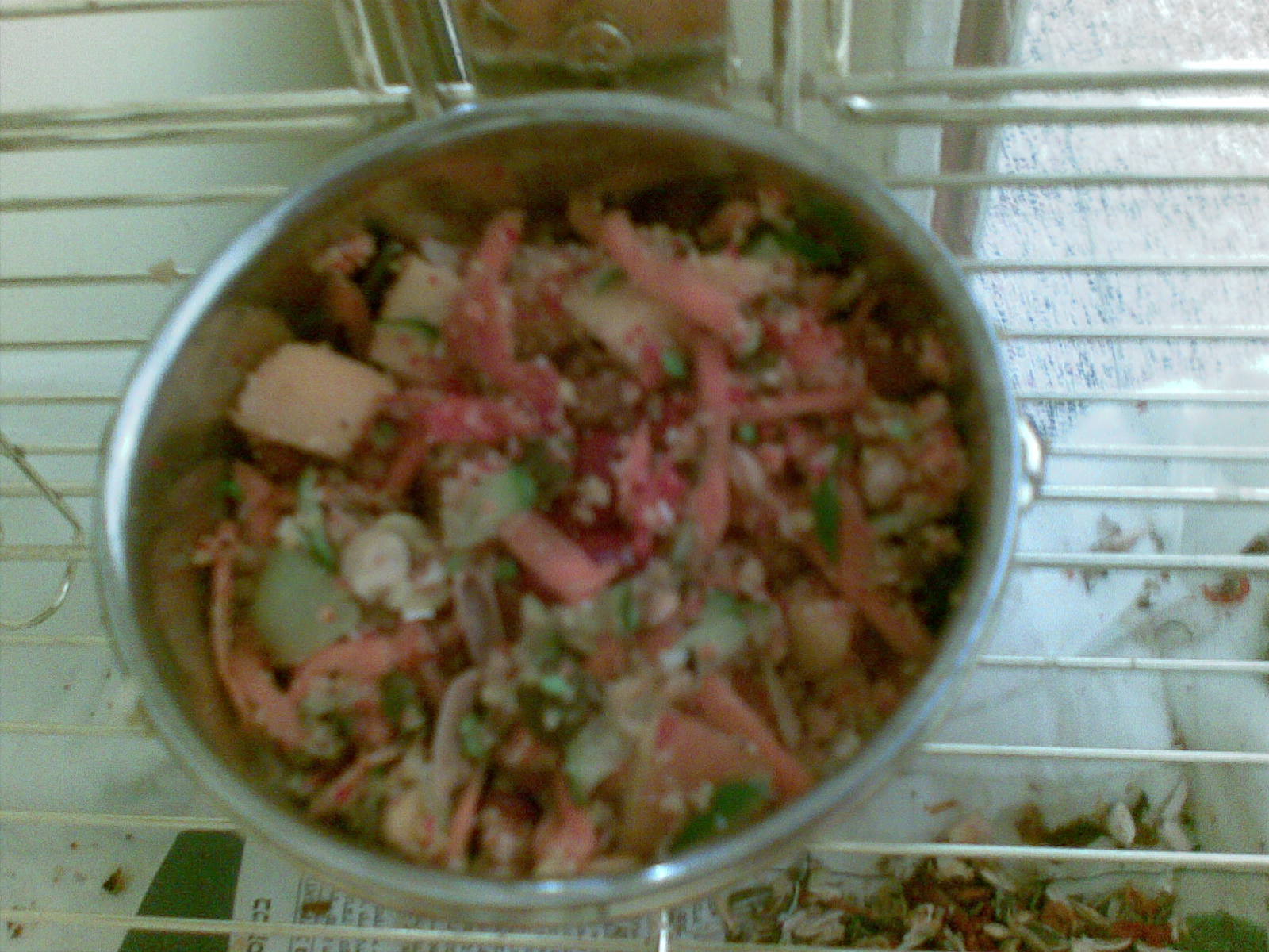 כל בוקר אני מפשירה מזה כפית ומוסיפה לזה תערובת השרייה, כפית מזון ביצים של אורלוקס, גזר, מלפפון, תפוח, ענבים, דובדבנים, פלפל אדום, משמש ובקיצור מה שיש בבית..