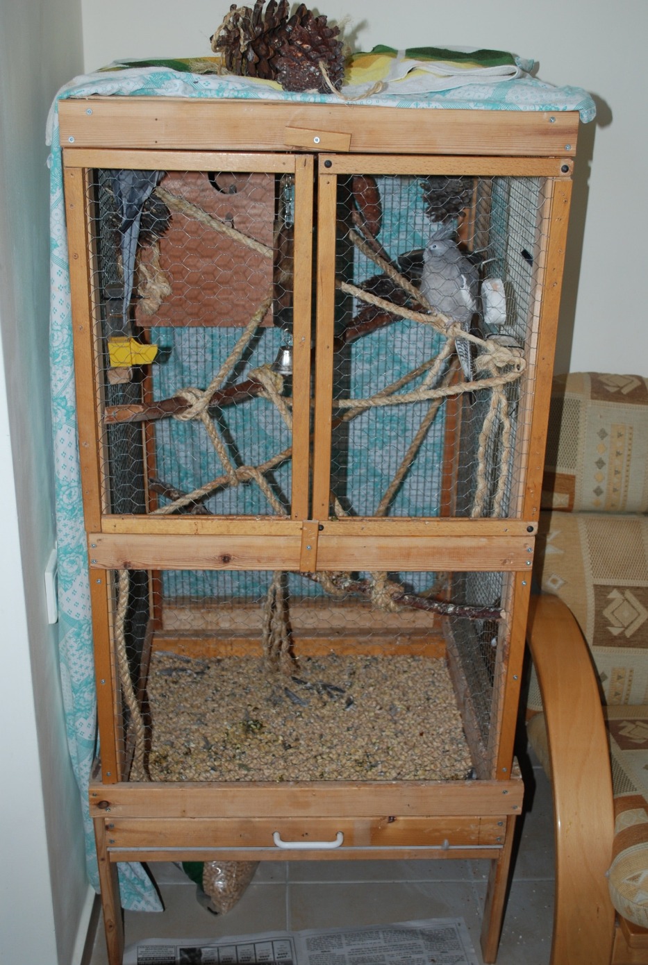 הכלוב של התוכים עומד בפינת החדר לא רחוק מהחלון אך לא מגיע אליהם קרני שמש ישירות.