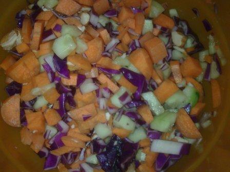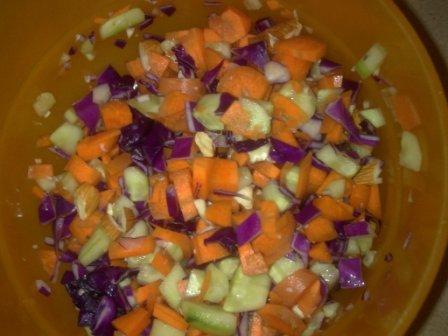 הסלט מורכב מ: כרוב אדום, מלפפון, גזר, שקדים טבעיים