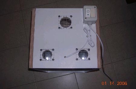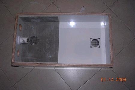 אני בניתי ככה רק עם פחות פתחים (2 בכל האומנת) מדחום בצד בצד אחד מנורה וכדי שהוא לא יגיע שמתי חתיכת של פלטת רשת ולמעלה זכוכית