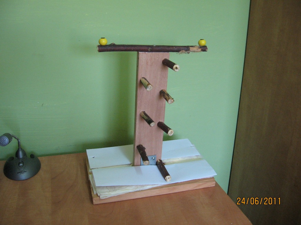 לא כ''כ חשבתי ועשיתי את המקלות עם מרווח קצת ביניהם והתוכי לא יכול לעלות בין מדרגה למגרה אז בהזדמנות אני אוריד כמה מקלות ואני אעשה רק 4 שלבים ככה שיהיה מרווח בין מקל ומקל והתוכי יוכל לעלות.
