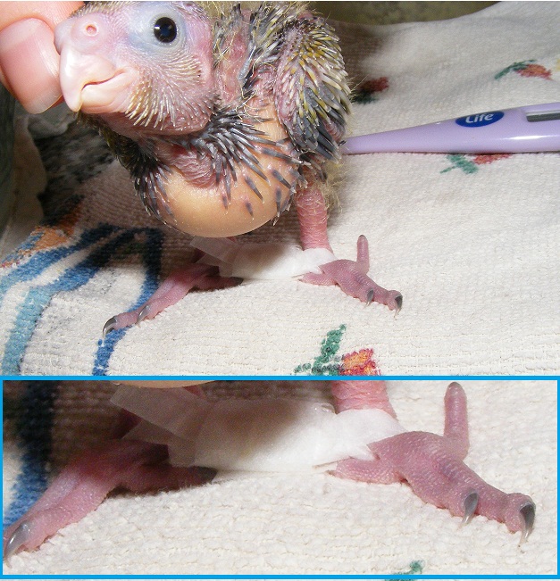 הגוזל מפוסק ונראה במצב גרוע. במקרה של גוזל כזה אם אין אפשרות להוציאו להאכלה אין ברירה אלא לקבע את הרגליים ולהחזירו לתא. בכל מקרה אין מה להפסיד.