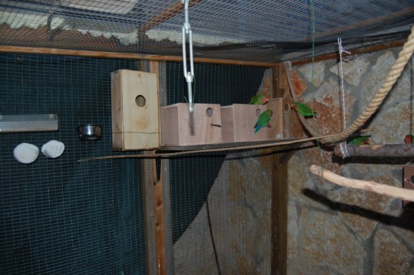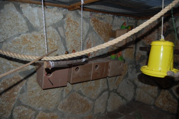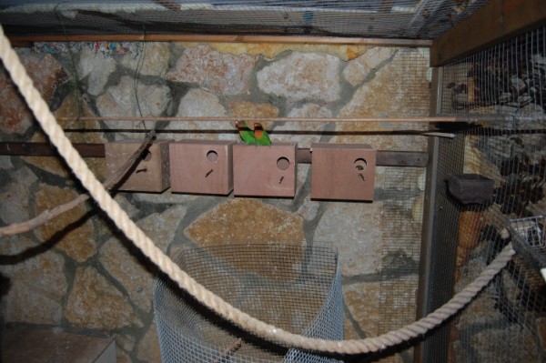 ערכתי מספר שינויים ותוספות בכלוב, חלקם מתבססים על עצות שקיבלתי בפורום. לדוגמה, גיליתי שהרכבתי חלק מתיבות הקינון לא נכון (לאורך במקום לרוחב) וגם פיזרתי אותן בגבהים שונים. אז הנה ה"שיכון" החדש: