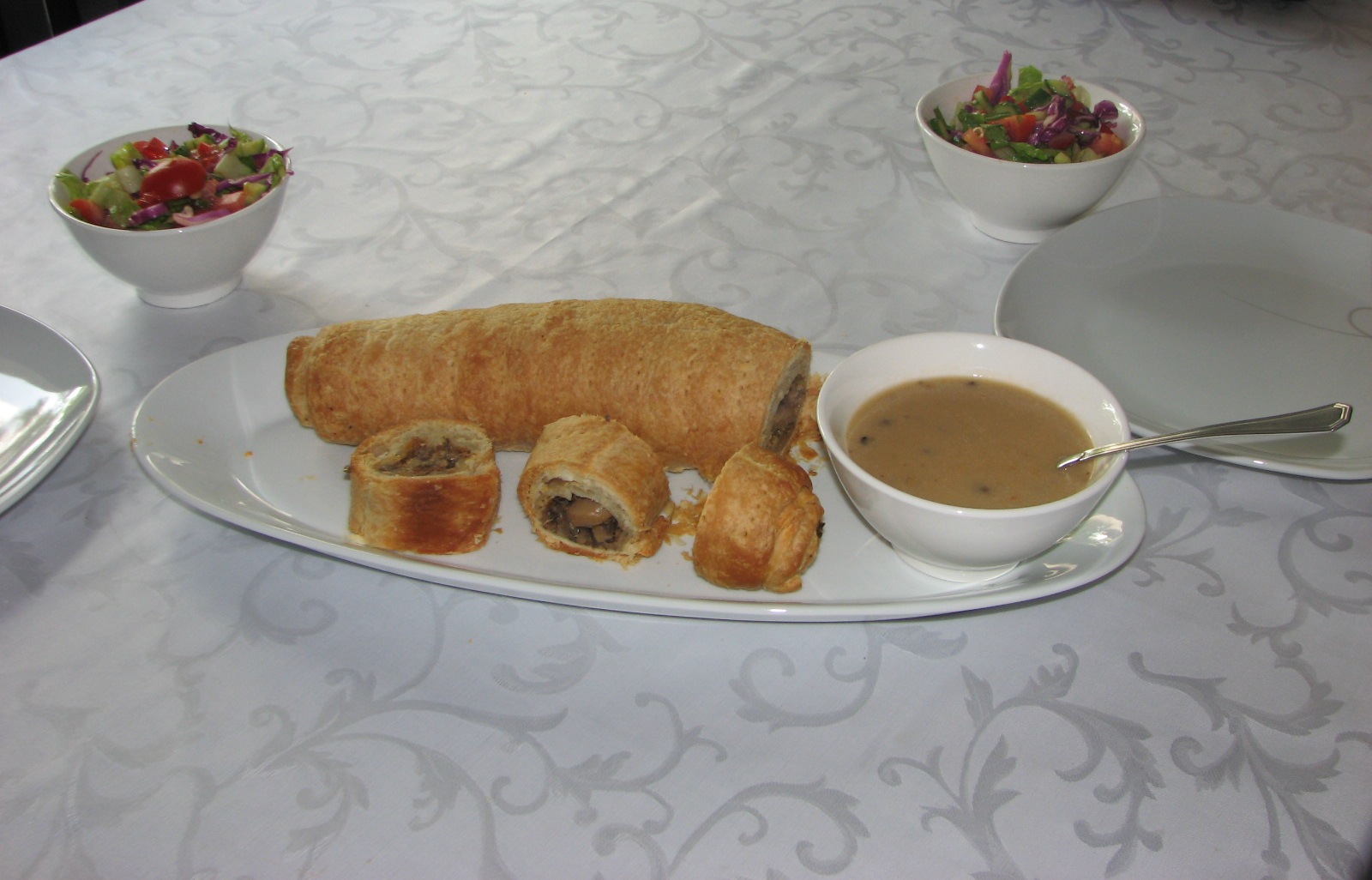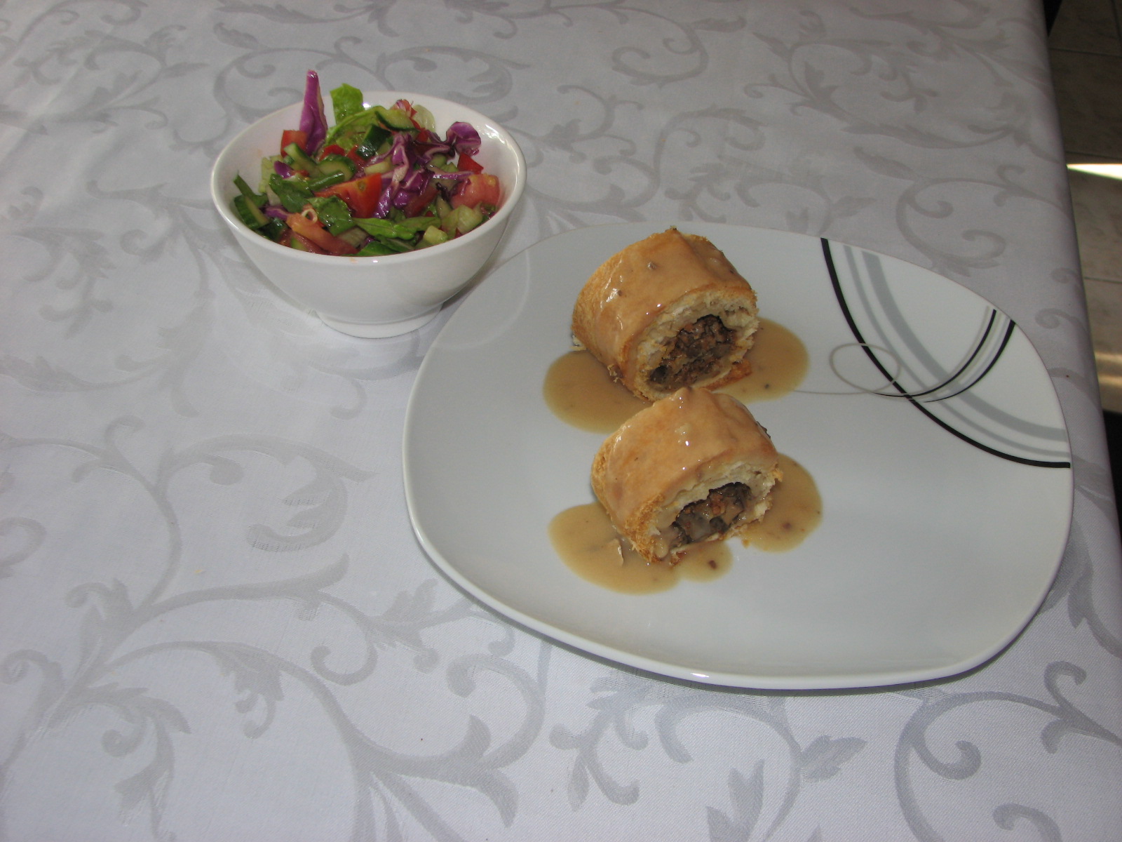 משטחים את בצק העלים ומחלקים ל3 , על כל 1/3 שמים מהתעברובת..(לא על כל הבצק אלא רק על כשליש ומגלגלים..סוגרים בקצוות....מחוררים למעלה מעט עם מזלג מורחים במעט שמן ויאללה לתנור 170 מעלות (בערך) עד להשחמה..