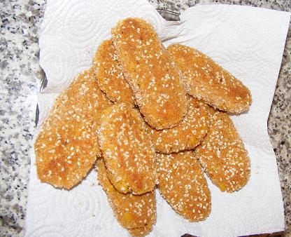 6. לוקחים כף גדושה מהתערובת ויוצרים שניצלון עגול\"אצבע", מצפים בפרורי לחם והשומשום ומניחים בקערה. חוזרים על הפעולה עד