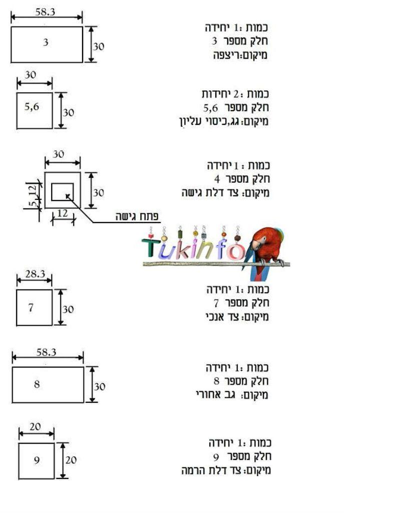 לנוחיותכם הכנתי שירטוט פשוט של החלקים המראה היכן יש לחתוך פתחים כשכל חלק ממוספר: